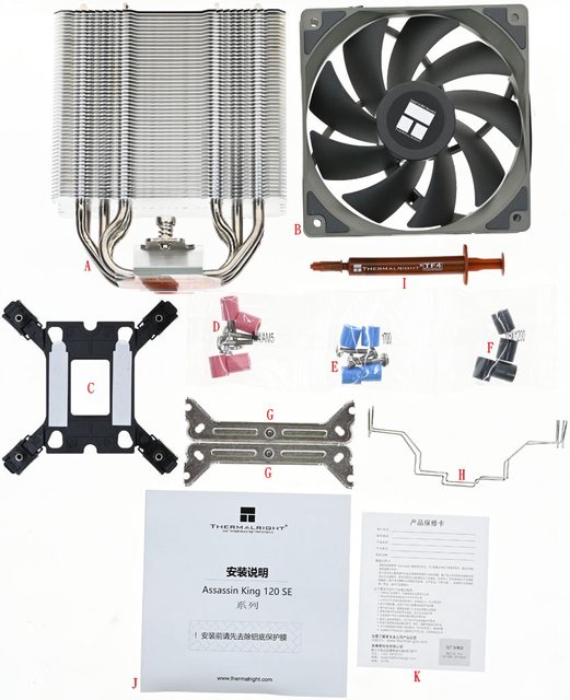(F)、托架(G)、風扇固定線扣(H)、TF4散熱膏(I)、安裝說明書(J)、保證書(K)
