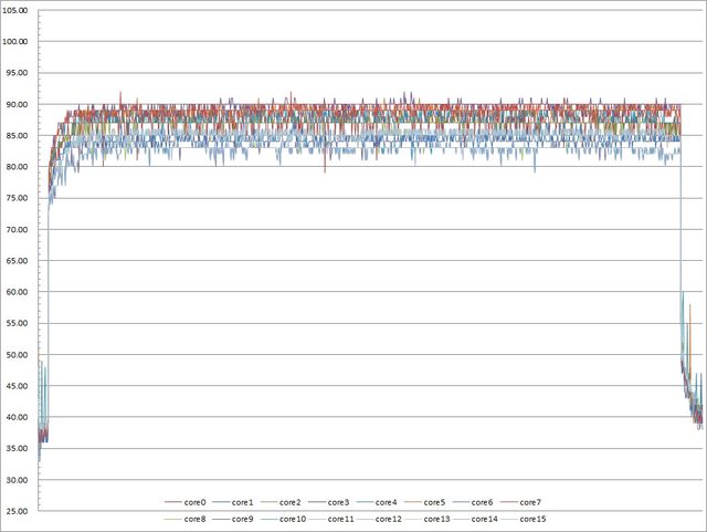 ▼功耗限制200W下高負載30分鐘CORE TEMP溫度記錄圖
