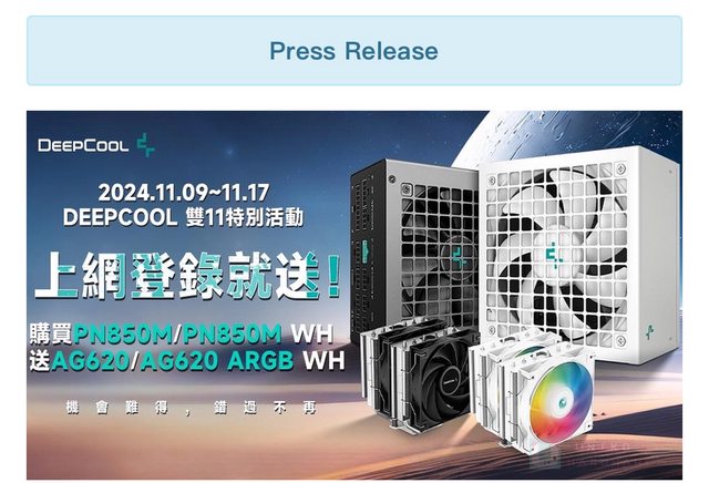 雙 11 DeepCool 不缺席!11/09 ~ 11/17 期間內,入手 DeepCool 指定型號電源供應器,並上網填寫表單通過審核,就能獲得 AG620 CPU 雙塔散熱器喔!