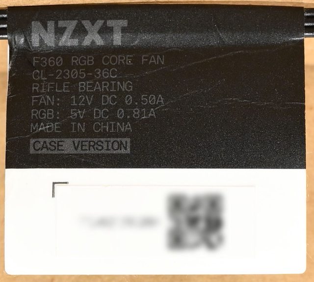 ▼機殼版F360 RGB Core單框3扇葉發光風扇於電源線路上的標籤,有商標、名稱、型號、
