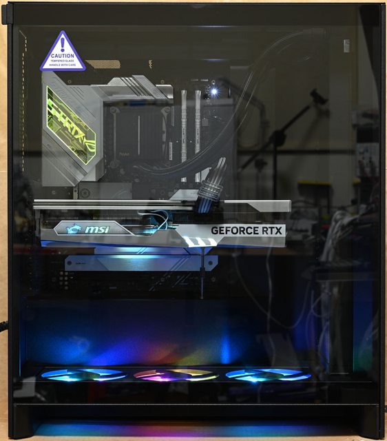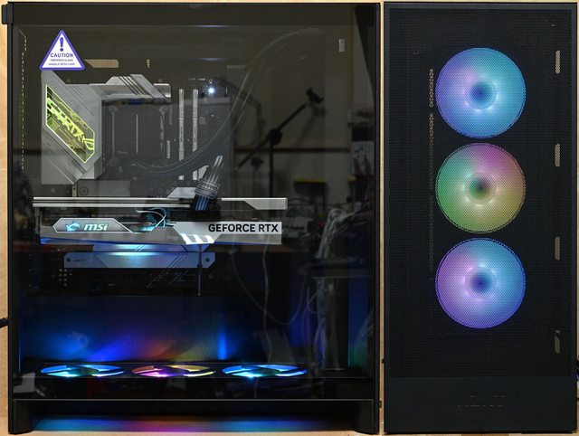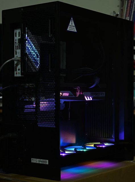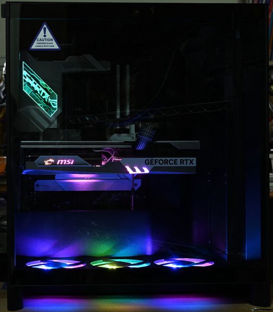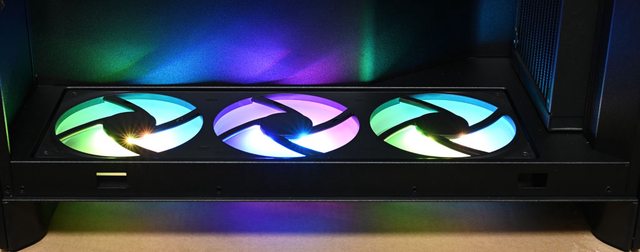 ▼機殼版F360 RGB Core單框3扇葉發光風扇裝在前方的燈光效果圖
