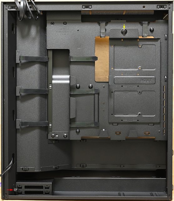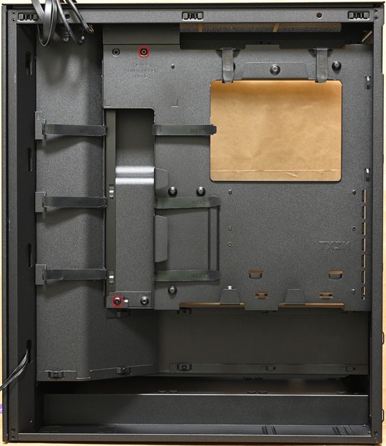 裝的通風擋板。靠近右側有4個線路整理用束線帶固定支架(紅框),下方電源安裝位置從