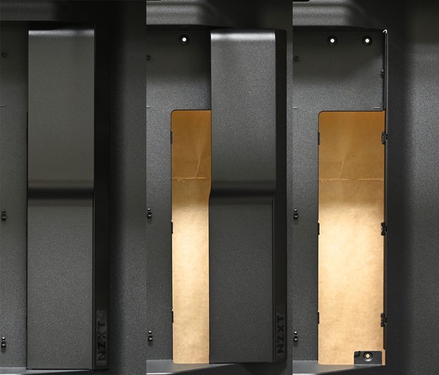 ▼整線擋板可依照ATX(左)、E-ATX(中)主機板改變安裝位置,也可拆除不裝(右)
