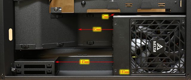 ▼右下安裝長度185mm的電源供應器時,電源供應器與底板背面下緣距離7mm,電源供應器