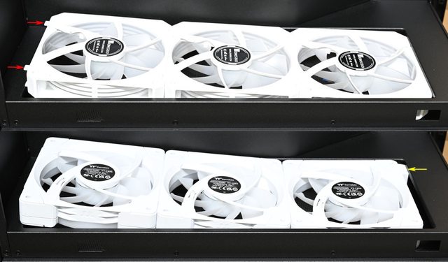 ▼左側下方長方形開口安裝串接風扇時,若是外框有凸出物(紅色箭頭)或是線路接頭過於