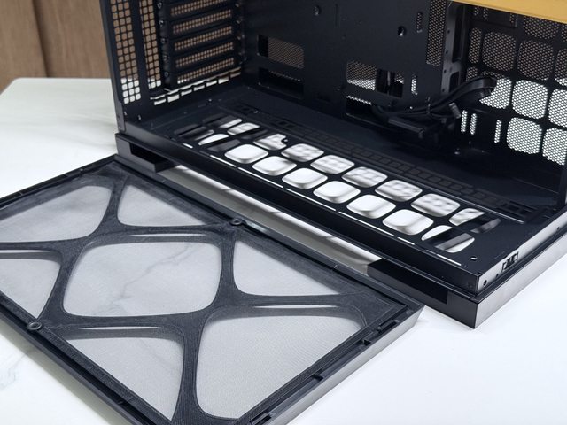 後方大面積開孔增加通風效率,上方拉抬的高度充足,讓機殼能支援厚冷排。