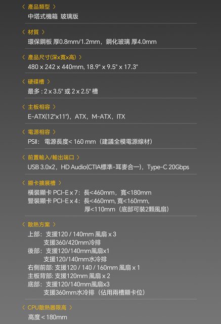‧顯示卡支援460mm長度、180mm寬度、110mm厚度