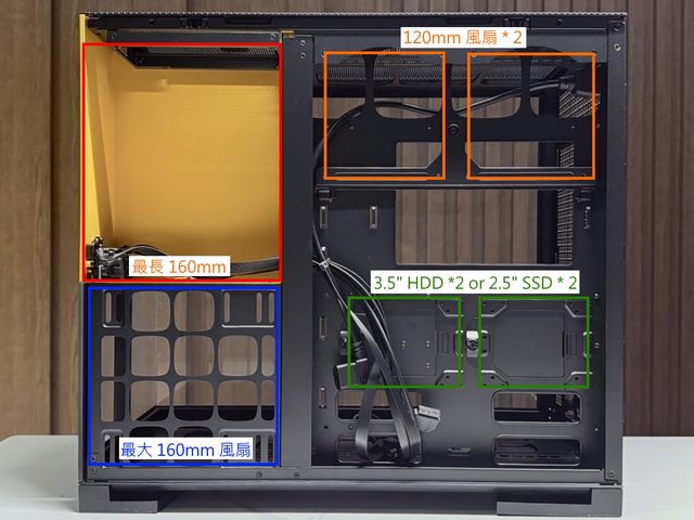 安裝2顆3.5"或2顆2.5",儲存裝置擴充性相比同類型機殼稍微弱一些。