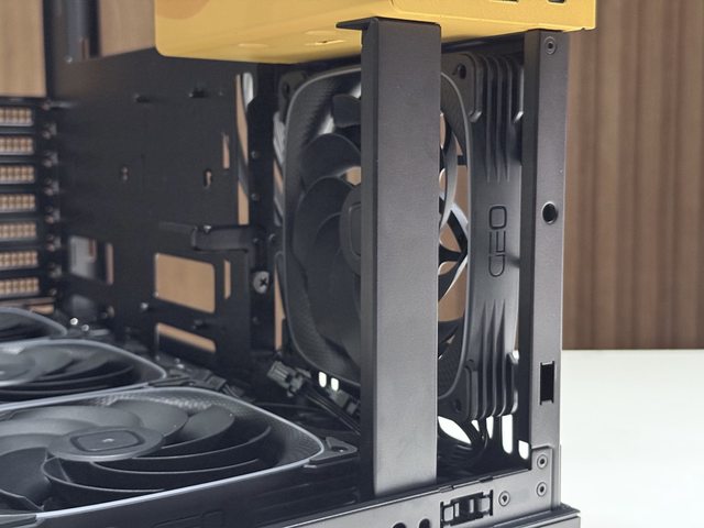 但這寬度要容納電源艙及420mm冷排,空間其實相當緊湊,也導致第一顆風扇需要轉方