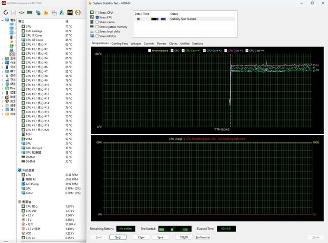 經過約14分鐘的FPU單烤,Package溫度約為88~89度,P核心平均83.875度,中間有一顆核
