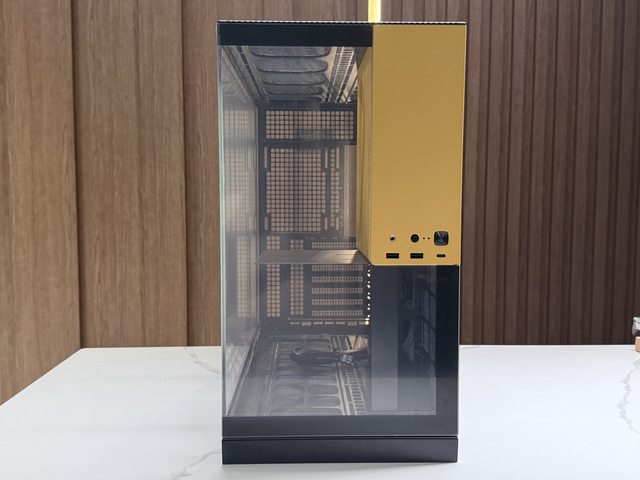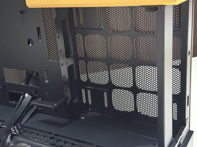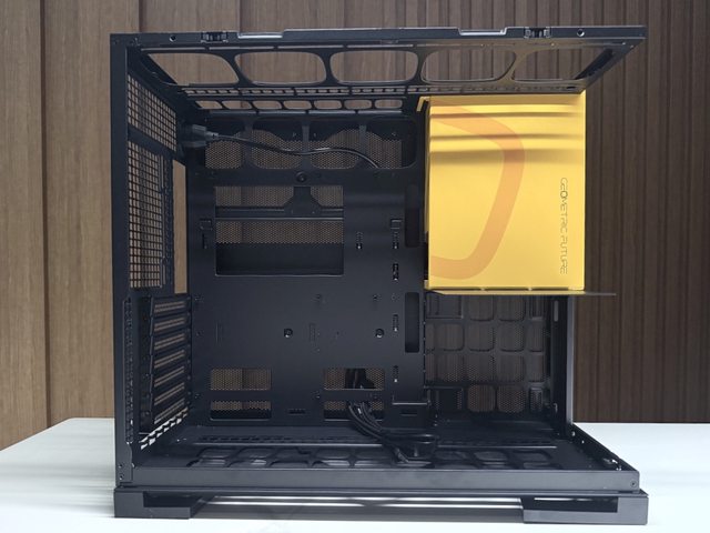 黃色跳色部分為電源艙,從右側上方延伸至前面板後做為IO位置,因此正面玻璃面板為了
