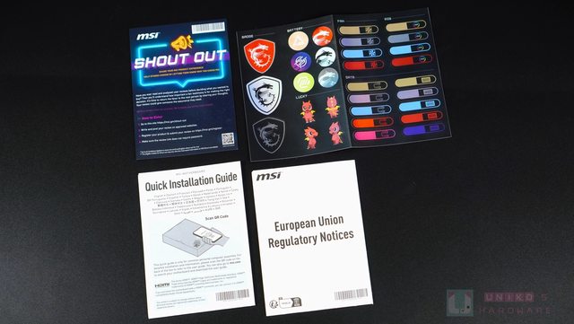 MEG Z890 ACE 配件包含三份文件,第一份是 MSI SHOUT OUT 活動,只要使用者到官網建立