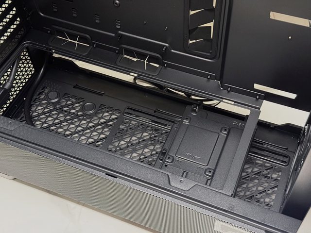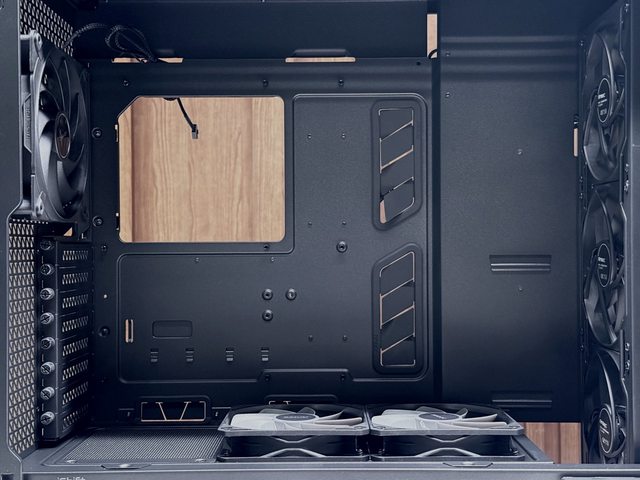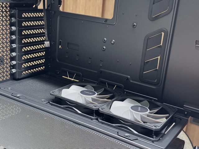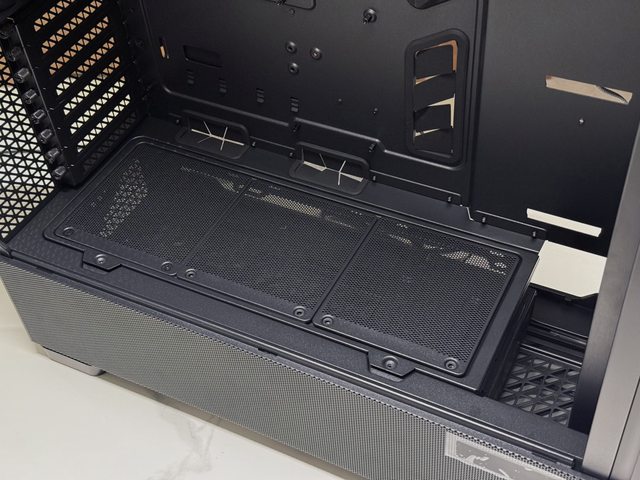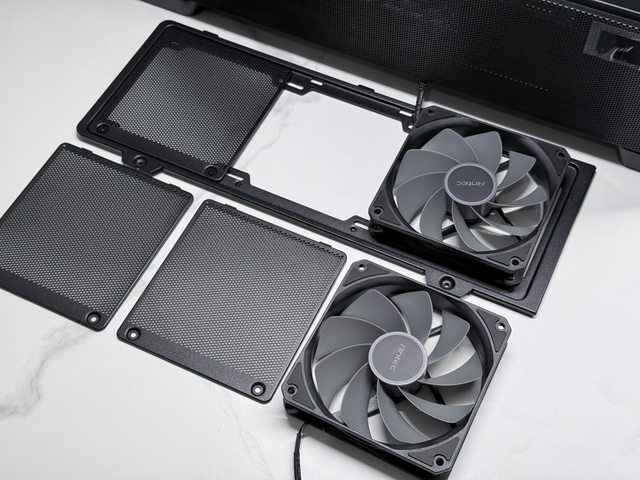 電源倉上方設置3個120mm風扇進風,其中2個已經預裝P12反向風扇,1個則以通風擋板遮