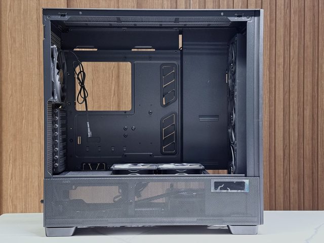 主要零件區域,個人覺得稍微可惜的是主機板與前風扇中間區域(背面為硬碟架)沒有設置