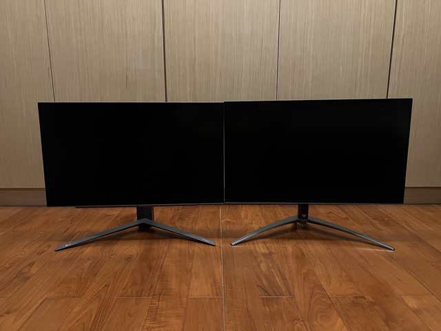 右邊是X27U(DP 1.4)、左邊是27GR95QE(HDMI 2.1)