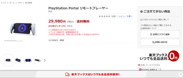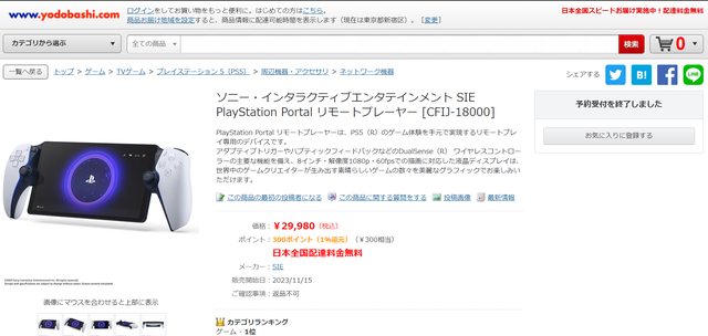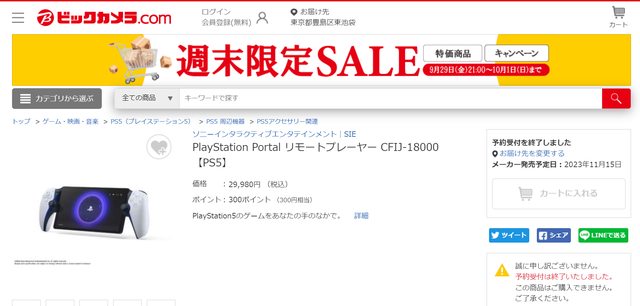 早上看日亞開賣時還有正常價29980 下午去看就剩下黃牛價格了 剛看推特有人說其他電商也賣完 查一下官網給的電商連結,都顯示已無法預購 糾竟是索尼又玩飢餓行銷還是其實只有5台庫存呢 是說發售日11/15很快就到了 然後台灣這邊還是沒有價格資訊,嘖嘖 日本PS Portal 官網介紹頁面 https://reurl.cc/x6laVE 完賣情況 Yodobashi https://i.imgur.com/g2tug1K.png