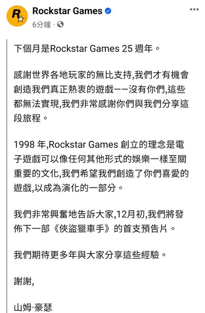 Next month marks the 25th anniversary of Rockstar Games. Thanks to the incredi ble support of our players worldwide, we have had the opportunity to create ga mes we are truly passionate about. We are very excited to let you know that in early December, we will release th e first trailer for the next Grand Theft Auto. We look forward to many more ye ars of sharing these experiences with all of you. Thank you, Sam Houser https://i.imgur.com/ShXQMEA.jpg