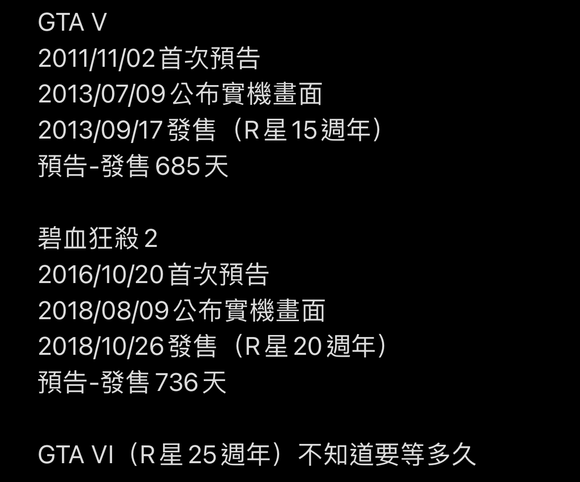 Nico0214: GTA4 GTA5 和RDR2 都是首支預告的兩年後上市 11/09 10:55