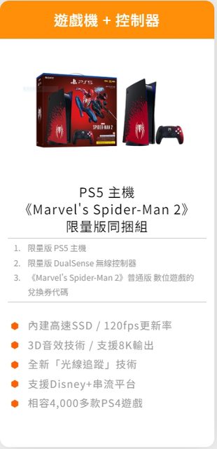 最近因小孩的電信資費快到期 因此想偷偷換台PS5給他當驚喜 目前台哥大的OP方案有興趣的有兩個 方案一:蜘蛛人主機&手把+Spider-man 2 兌換券 方案二:一般主機殼&手把+1000點+FF16 兌換券 https://i.imgur.com/9v8uOUy.jpg