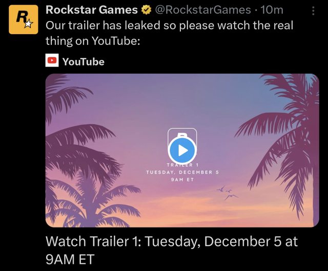 R星又出包了?原本預計美國時間12/5早上發布的預告片剛剛突然釋出。跟大家預計的一 樣就是新一代GTA,地點在罪惡之都Vice City,同之前流出的訊息是雙主角制,也是系列 作首次有可操控女角。 發售日定在2025年,希望不要延期啊! https://i.imgur.com/U1VeuUR.jpg