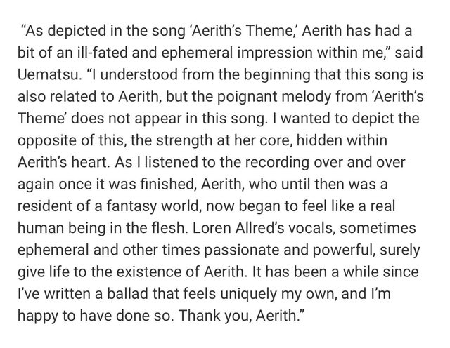 就如同「艾莉絲主旋律」所描繪的那樣, 艾莉絲在我心底 一直給我有種「命運多舛」和「轉瞬即逝」的印象。 我從一開始就知曉,這首新曲是會與艾莉絲有關, 但「艾莉絲主旋律」的酸楚旋律, 並沒有出現在這首歌當中。 我想在歌曲裡體現完全相反的景況: 那股在她核心深處埋藏著的,真正的心靈力量。 在這首歌完成之後, 我一遍又一遍重複聽著這個旋律, 艾莉絲在這之前,一直是一名幻想世界的住民, 但轉瞬間,彷彿她就像是一個活生生存在的人一般。 主場Loren Allred的歌聲時而短暫, 時而激情又有力量,著實替艾莉絲注入了生命。 我已經很長一段時間, 沒有創作出這麼獨特的歌謠了, 很高興又能完成這樣一首歌。 Thank you, Aerith. http://i.imgur.com/1Ek0XnR.jpg