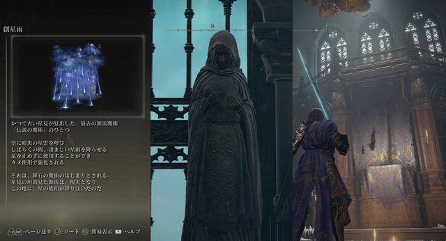 ▲起源魔法「創星雨」、女性魔法師雕像、魔法學院大講堂中心的紫色布幕