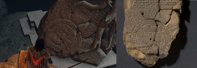 ▲老人雕像腳邊的石板與其原型的巴比倫世界地圖