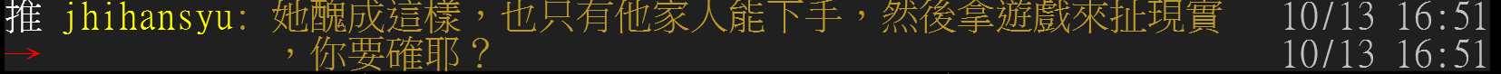 推 jhihansyu: 她醜成這樣,也只有他家人能下手,然後拿遊戲來扯現實 10/13 16:51