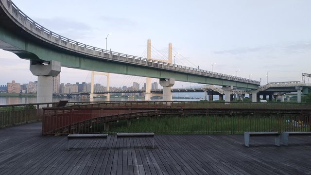 見到玩家們聚集在棧道上,從棧道一眼望去就是連接蘆洲跟社子地區的重陽大橋。