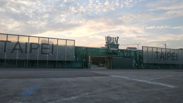 點。疏散門迷彩圖樣,配上兩側大大的「TAIPEI」裝置藝術,後面又是一望無際的天空,