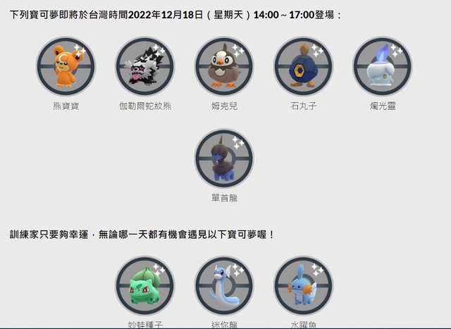 下列寶可夢即將於台灣時間2022年12月18日(星期天)14:00~17:00登場: