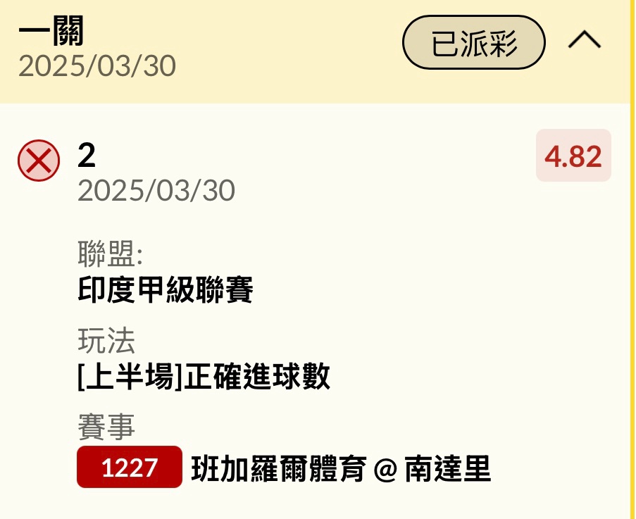 班加羅爾體育 1 - 2 南達里 29' 南達里 HT-- 0:1 -- 85' 南達里 90' 班加羅爾體育 FT-- 1:2 -- 印度甲 -- ※ 發信站: 批踢踢實業坊(www.ptt.org.tw), 來自: 125.230.28.207 (臺灣) ※ 文章網址: https://www.ptt.org.tw/SportLottery/M.1743323406.A.448
