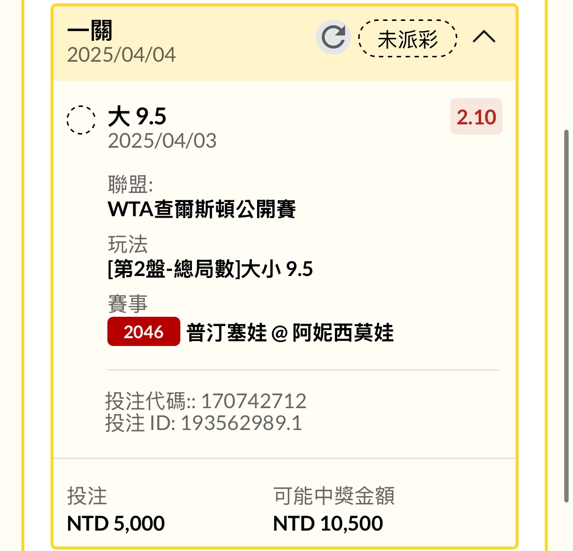 一 二 T 普汀塞娃 4 4 0 阿妮西莫娃 6 6 2 WTA查爾斯頓公開賽 紅土 -- ※ 發信站: 批踢踢實業坊(www.ptt.org.tw), 來自: 125.230.20.118 (臺灣) ※ 文章網址: https://www.ptt.org.tw/SportLottery/M.1743693800.A.18D