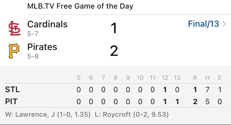 2025 Major League Baseball regular season PNC Park, Pittsburgh, Pennsylvania https://i.imgur.com/2VVNkzp.jpeg St. Louis Cardinals 5-6 Pittsburgh Pirates 4-8 匹茲堡海盜 勝 1.80 匹茲堡海盜1分 4.00 敬請齊推:鄭宗哲加油! https://i.imgur.com/i3z0u5J.jpeg MLB TV Free Game of the day 任務遊戲: 倘若本場順利見證Tsung-Che Cheng初登板 只要海盜獲勝→即贈壹位臺灣球迷新臺幣999元 -- ※ 發信站: 批踢踢實業坊(www.ptt.org.tw), 來自: 111.83.225.242 (臺灣) ※ 文章網址: https://www.ptt.org.tw/SportLottery/M.1744214708.A.A9A