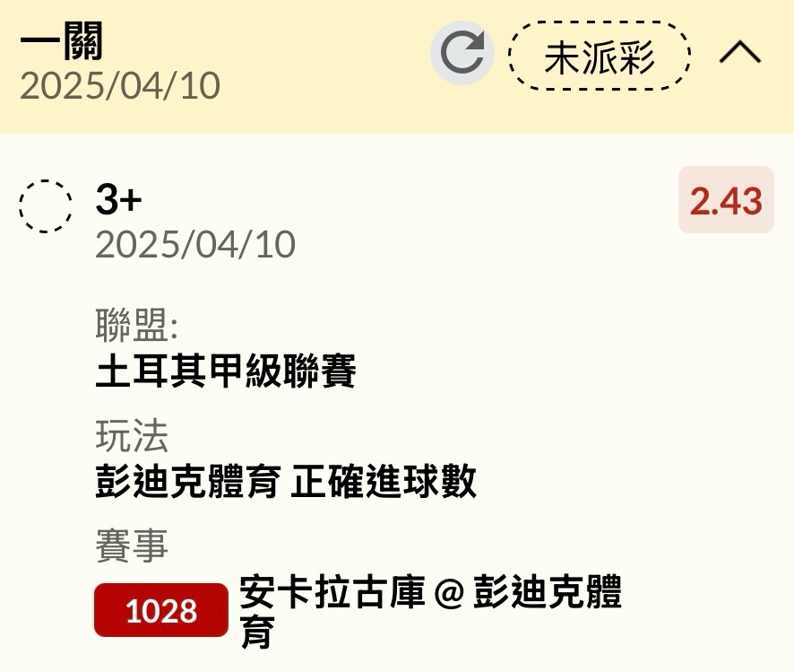 有車車嗎 安卡拉古庫@彭迪克體育 14’ 安卡拉古庫 19‘ 彭迪克體育 35‘ 彭迪克體育 ——- 1:2 H T ——- ——- 1:2 F T ——- -- ※ 發信站: 批踢踢實業坊(www.ptt.org.tw), 來自: 49.218.91.26 (臺灣) ※ 文章網址: https://www.ptt.org.tw/SportLottery/M.1744216897.A.443