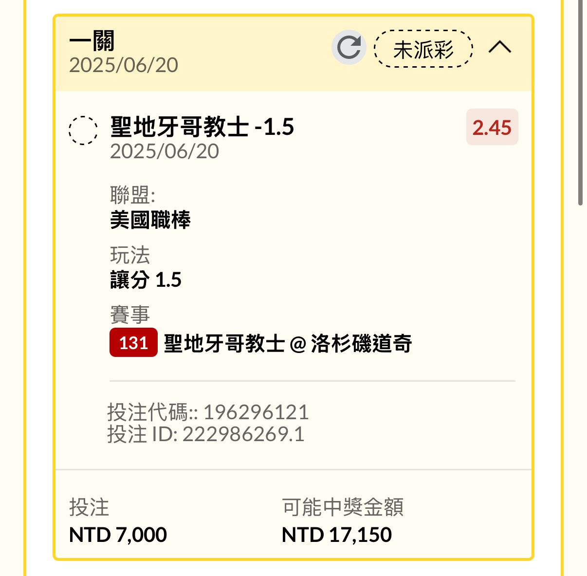 教士010010120 5 道奇000000003 3 快樂星期五,當然是當薪水小偷賭運彩 ----- Sent from JPTT on my iPhone -- ※ 發信站: 批踢踢實業坊(www.ptt.org.tw), 來自: 42.72.96.41 (臺灣) ※ 文章網址: https://www.ptt.org.tw/SportLottery/M.1750383952.A.F85