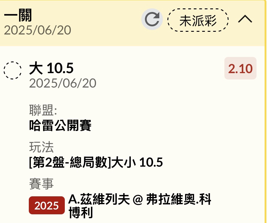 一 二 三 A.茲維列夫 6 7 弗拉維奧.科博利 4 6 ----- Sent from JPTT on my iPhone -- ※ 發信站: 批踢踢實業坊(www.ptt.org.tw), 來自: 42.72.96.41 (臺灣) ※ 文章網址: https://www.ptt.org.tw/SportLottery/M.1750415700.A.BC7