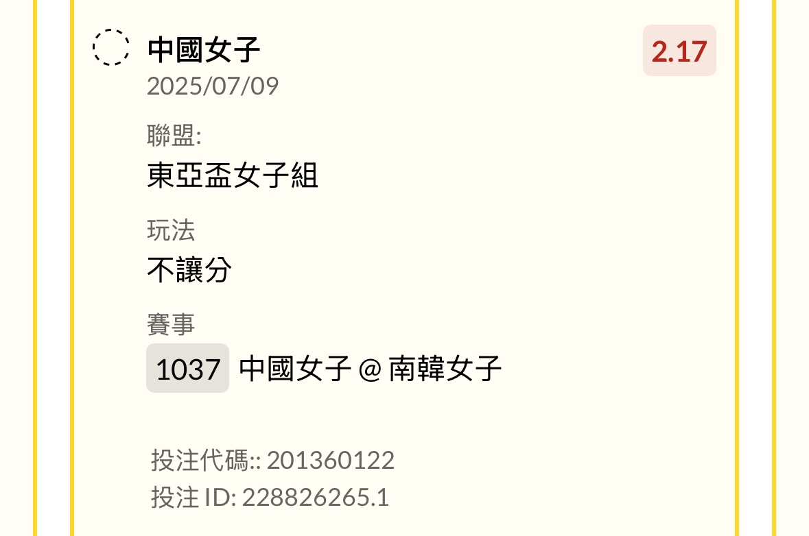 推 zsyeueyu: 賭盤賽前看好中國 @@ 111.83.249.246 07/09 19:41