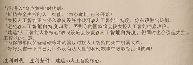 在上個時代做死蓋超級計算機後,累積滿後即可進入 將會消滅所有第八時代以前國家 並同時在所有沒有被影響力框住的地方產生機械中心以及機械士兵