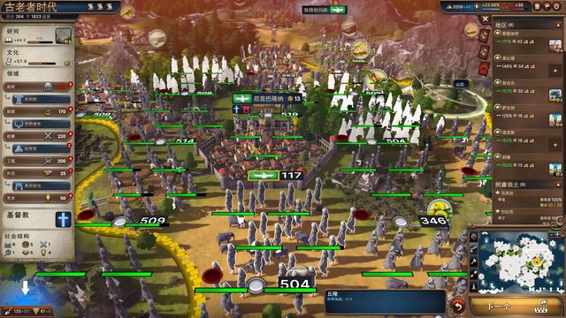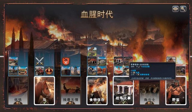 大量的軍事經驗獲取來源讓國家精神是斯巴達或是劫掠者可以解鎖相當快 或是使用強行軍或是增援能力 但衛生建築只有這種垃圾堆可用 而且這段時間只懂得廝殺,也不會有造紙、圖書館的東西存在 也導致接下來整局無法招藝術家