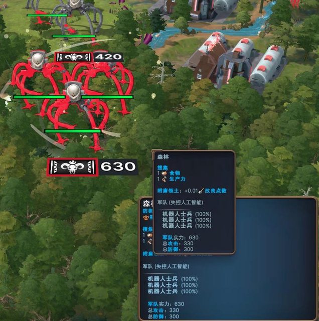 這些機械人中心與士兵戰鬥力比外星人飛碟還弱 但可怕的再於,它們每2回合就會生產1台士兵 它們甚至還會疊兵,其戰力疊起來非常可怕
