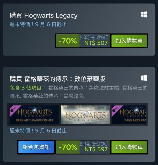 最近回頭補哈利波特小說,蠻喜愛的 所以一直在等霍格華茲的傳承特價 今天一早收到願望清單的特價通知 看到-70%就立刻買了,童年回憶啊qwq 這價錢應該是史低了吧? 《霍格華茲的傳承》507元 《霍格華茲的傳承》數位豪華版 597元 https://i.imgur.com/MEUXBXL.jpeg
