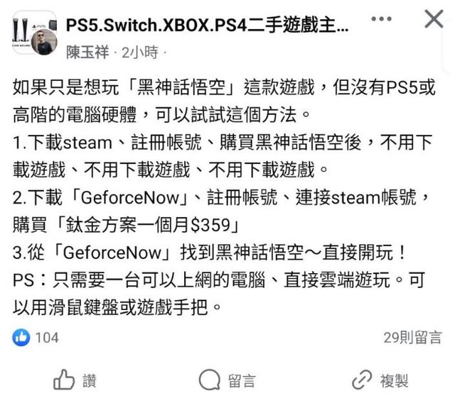 想了一下還是放在這裡, 首先是黑神話悟空因為目前只能PC或PS5跨區,雖然帶起了一波裝機潮 但還是有不少人不能玩, 接著之前我在PS5社團就看到了這一則。 https://i.imgur.com/7m42K4A.jpeg