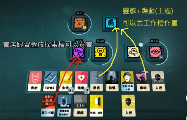 像是把書丟進研究槽,可以破解書籍內容;把書店跟資金拖進探索槽可以去買書。