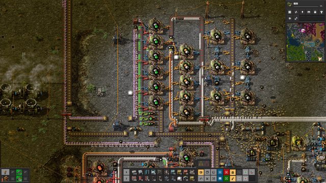 Factorio目前玩到前進第二個惑星(葛萊芭星),這顆星球完全沒有鐵礦、銅礦。 但是有可以變成鐵礦和銅礦的細菌和植物。要將星球上的水果加工製成生物燃料和精華 ,然後再進一步做成細菌。細菌經過一段時間死掉之後就會變成金屬礦物。 不得不說這個資源再生循環我覺得做得非常棒! 跟以往Factorio裡的資源循環有很大的差別。 不過這個星球出產的水果和加工物經過一段時間後都會自然腐化,變成廚餘。 所以在加工上多了時間限制的因素,有點麻煩。 然後這個星球還有超大型怪物會攻擊玩家基地,玩家被踩到直接秒殺死亡。 另外,太陽能在這顆星球的效能也非常差,也沒什麼空地可以蓋大型太陽能電廠。 相比之下,第一顆惑星(岩漿星)和原本的星球根本天堂... @@ 附上基地圖~ https://i.imgur.com/W03cvrQ.jpeg