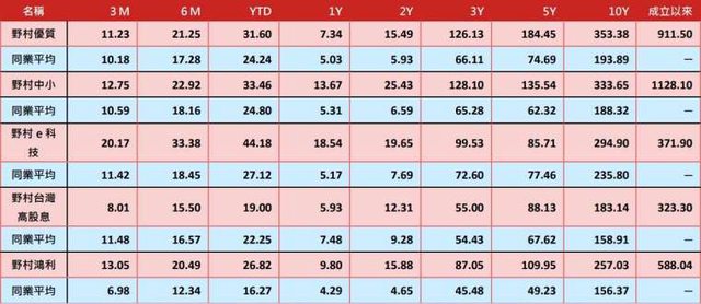 上表之同業平均依序分別為 SITCA 國內股票型一般股票型、中小股票型、科技股票型、
