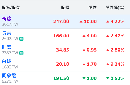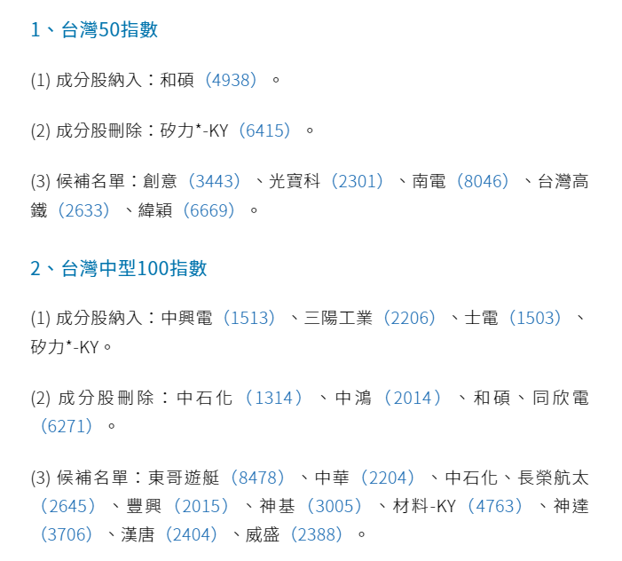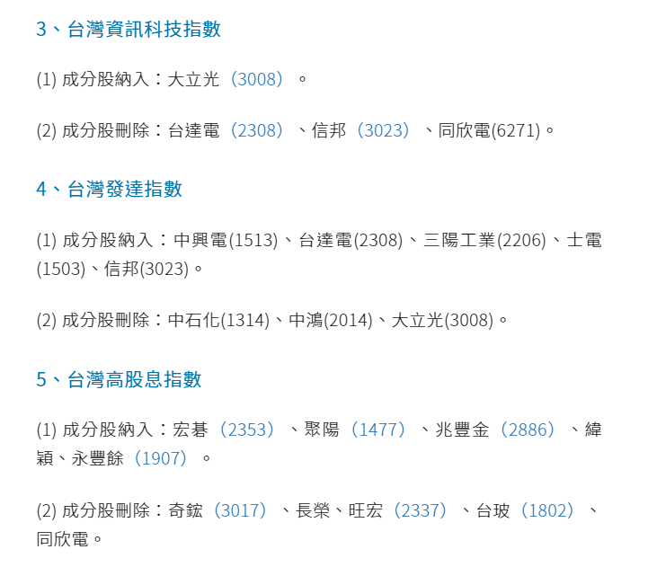 (二)成分股刪除:奇鋐、長榮、旺宏、台玻、同欣電。