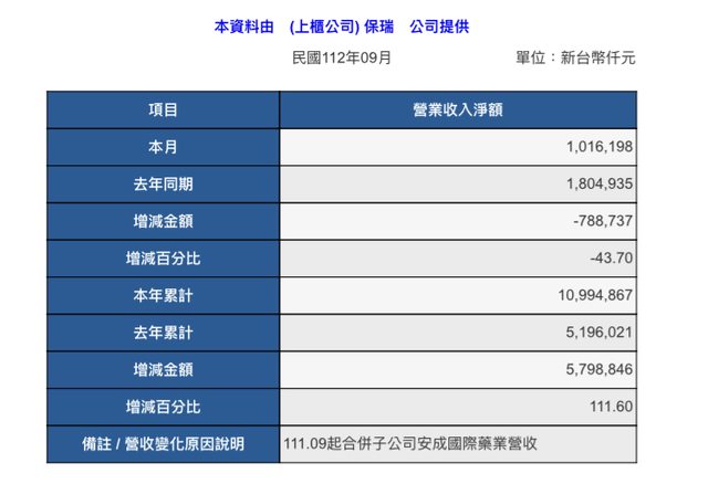 標題[情報] 6472 保瑞 112年9月營收