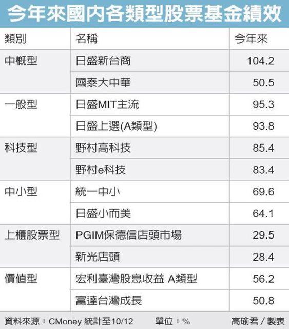 則為一般型的日盛MIT主流基金、日盛上選基金,分別有95.3%及93.8%漲幅。科技型的野村高