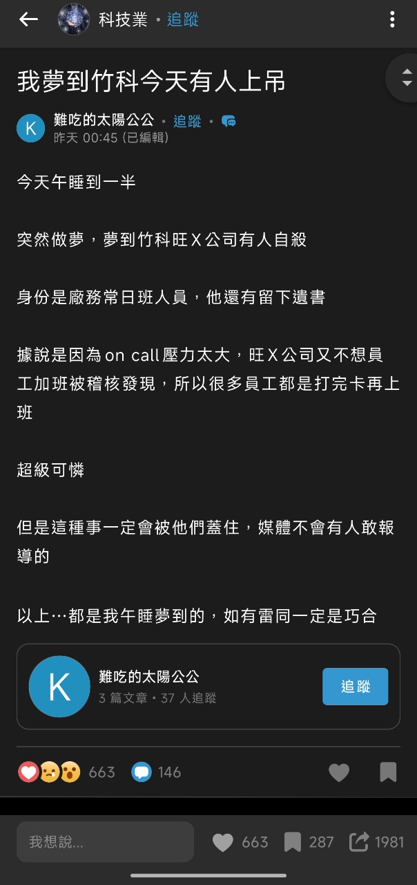 噓 t288850 : 旺宏有好到寧可自殺也不離職? 07/03 18:54